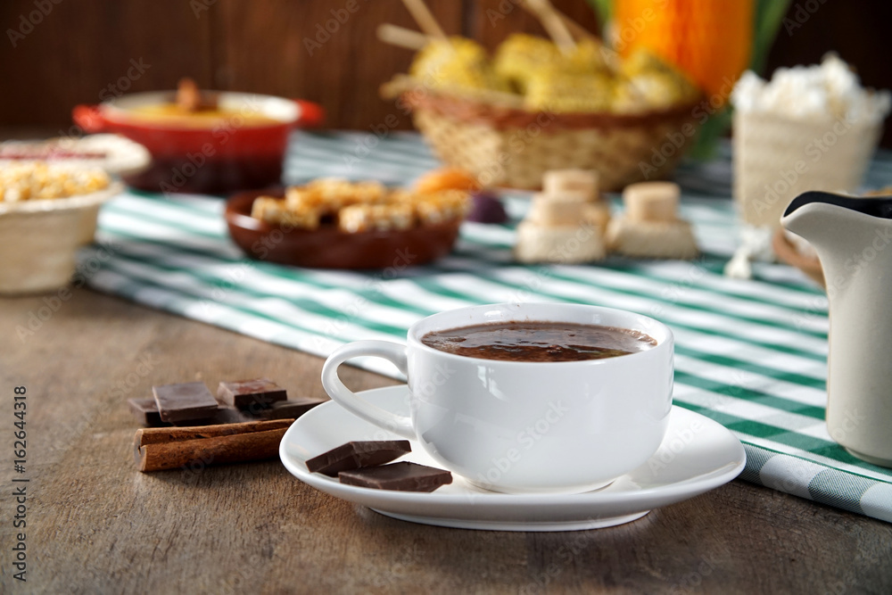 Hot chocolate on the Table with some Brazilian delicious. Festa Junina Theme