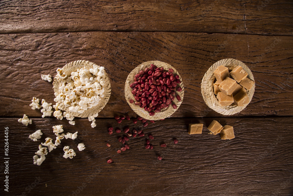 popcorns, Raw peanuts and sweet milk on a table. Brazilian Festa junina party.