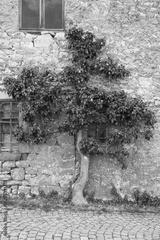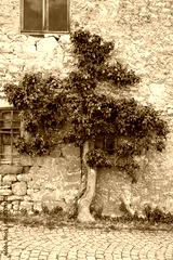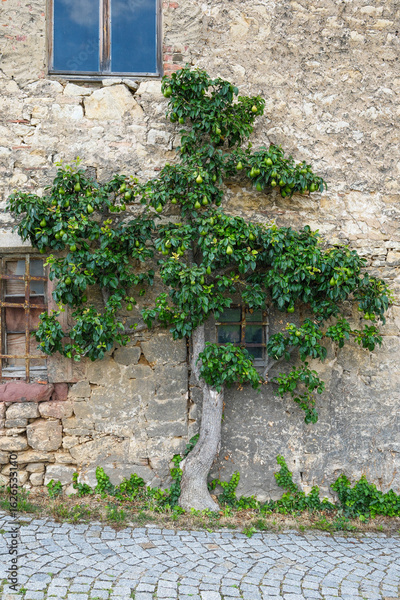 Birnenspalier an der Hauswand eines verfallenden Gebäudes.