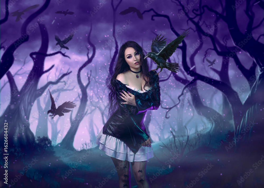 Witch girl in a dark forest with a raven on her shoulder.