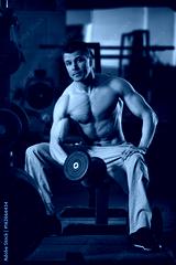 Bodybuilder workout with dumbbells in gym, perfect muscular male body