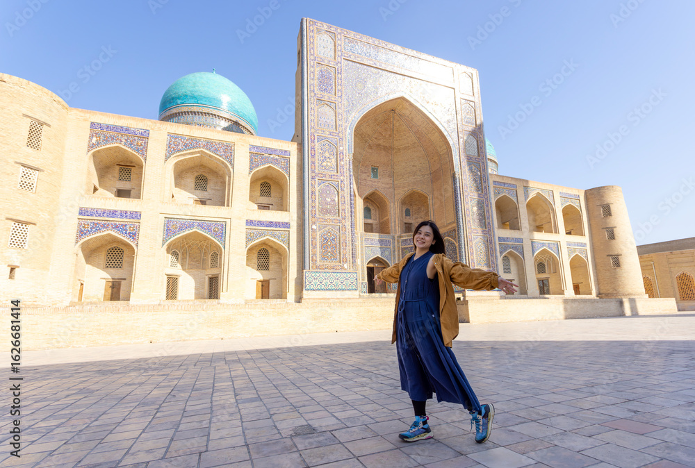 woman as a tourist have fun in front of Poi-Kalyan Kalyan mosque in bukhara Uzbekistan
