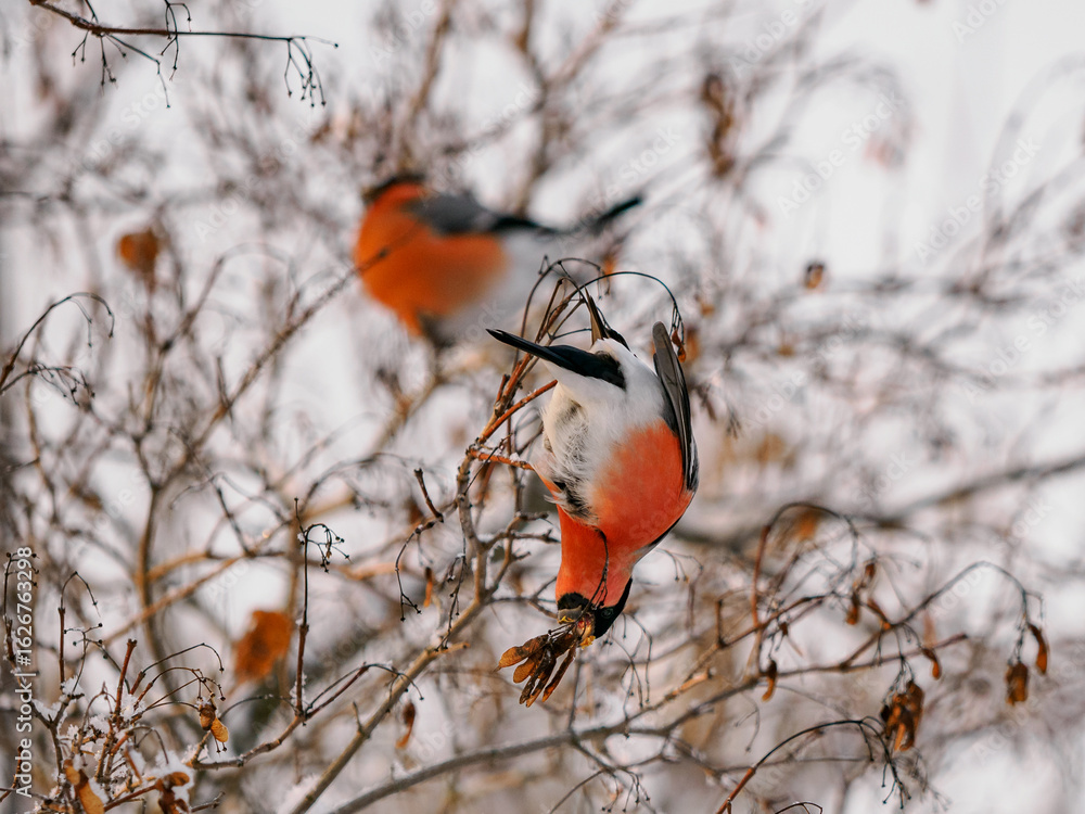 Bullfinch eating maple seeds on maple tree. Funny and cute bullfinch in wild nature, in cold winter weather. Two male bullfinch in beautiful sunset light. Birdwatching and environmental concept