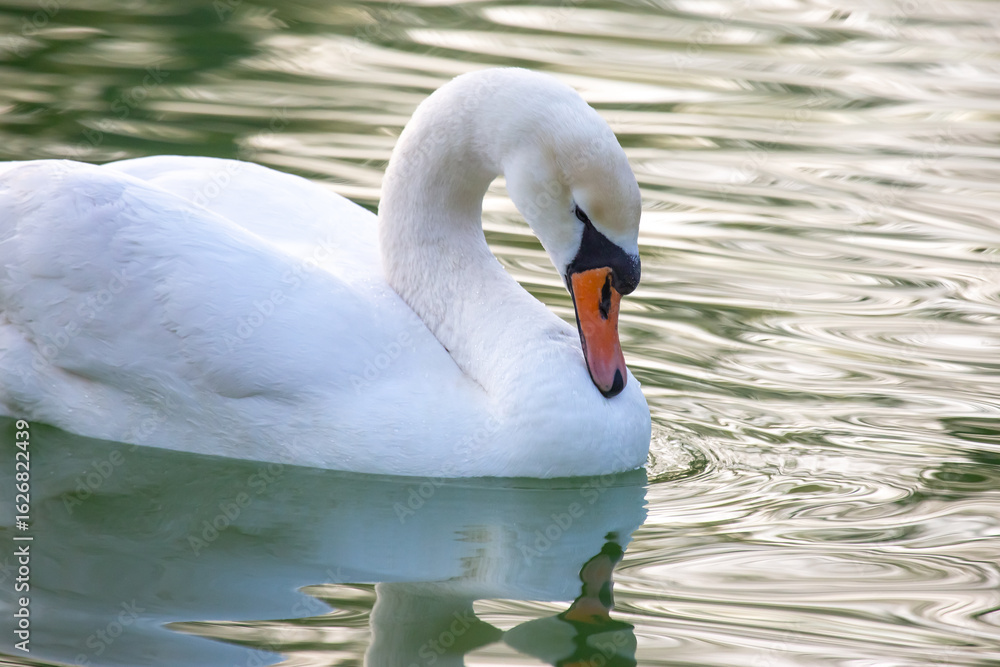 Elegant swan gliding gracefully on the serene water surface in a tranquil pond