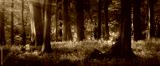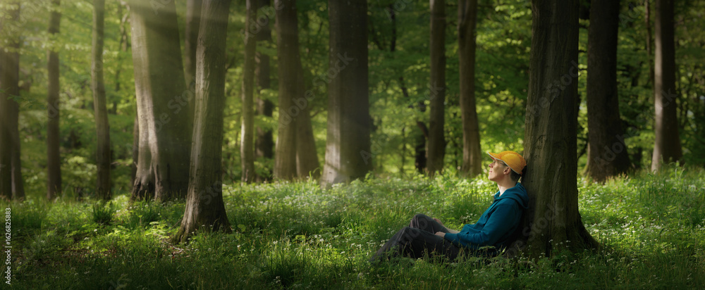 Young man sitting under trees in the forest and looking into the gentle tranquil rays of sunlight. Panoramic format.