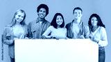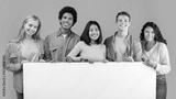 Education, ad and student recommendations. Diverse teens cheerful international students holding big banner with free space and ready to study at college, isolated on beige background, studio shot
