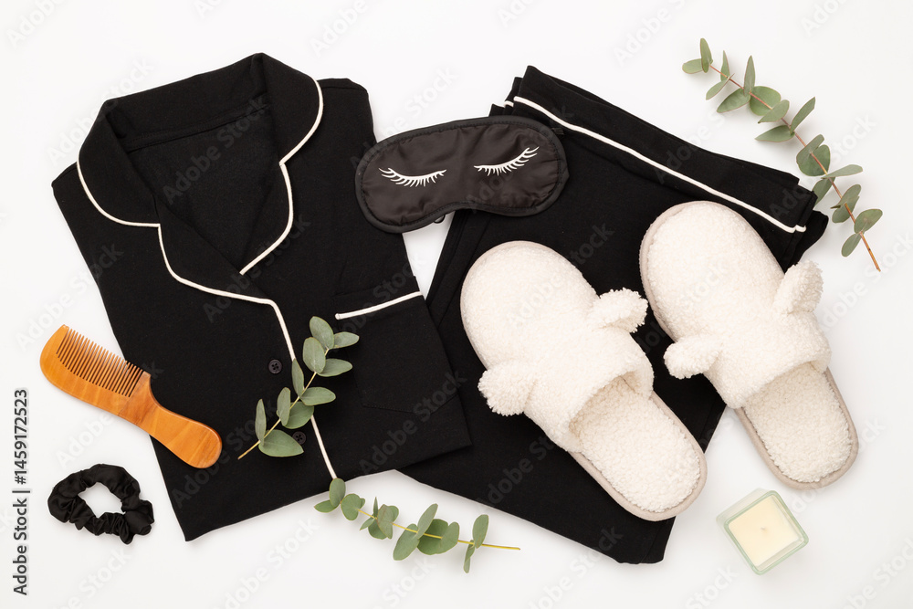 Sleeping mask with accessories on wooden background, top view. Sleeping routine concept