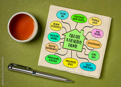 Create a healthy home. It supports physical well-being, emotional balance, and mental clarity, a personal wellness sanctuary. Infographics mind map.