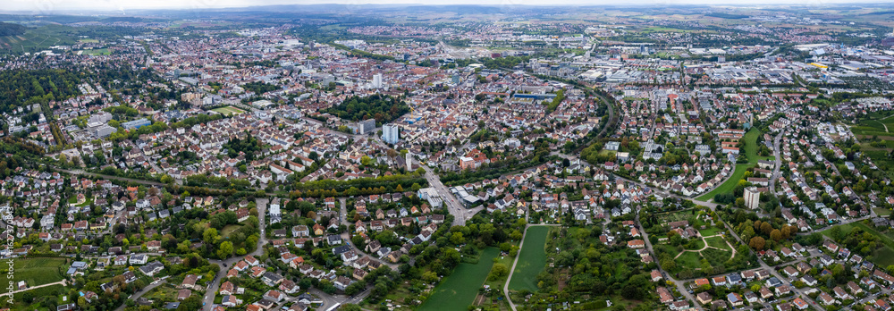 Aerial view around the city Heilbronn in Germany. On a overcast day in spring.