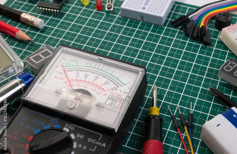 DIY electrical maker tools components on green cutting mat board. DIY electrical maker tools with copy space for text on green background. DIY electrical handmade tools electronic maker components.