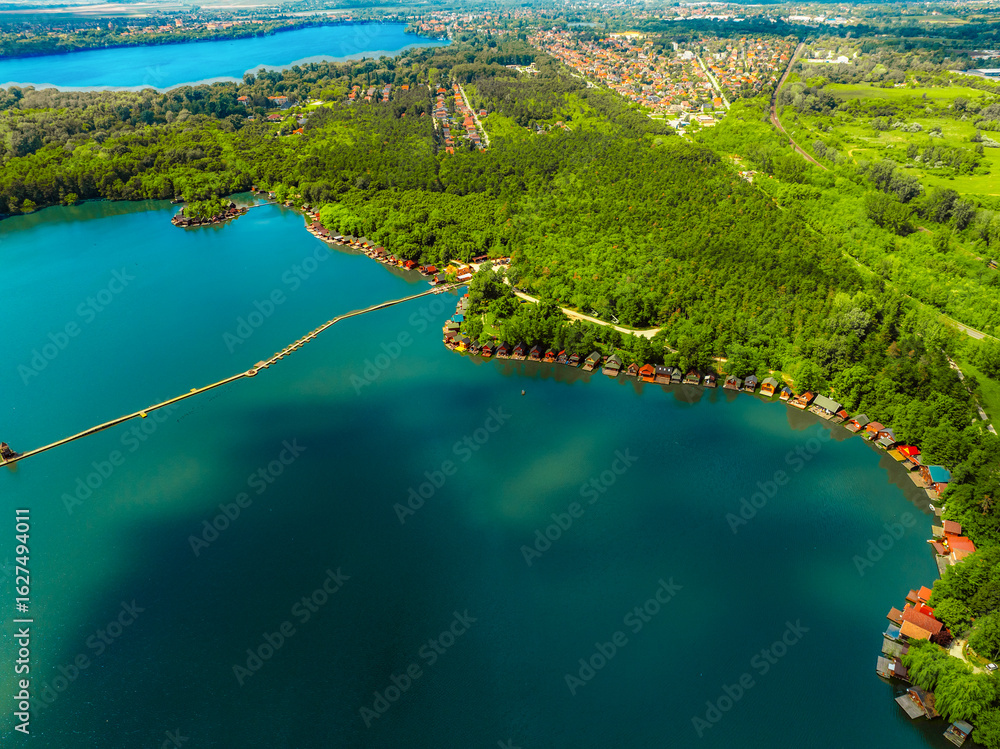 Floating village tata in Hungary. Houses belong to local fishermen. aerial