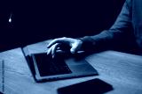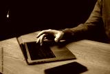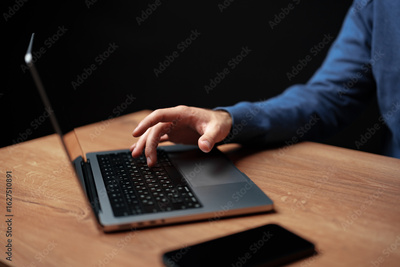 User types on laptop keyboard during late night work session at home in a dimly lit room