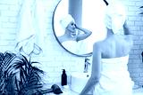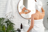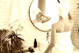 Woman preparing for her day in a modern bathroom with elegant decor and natural elements
