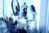 Woman drying her hair in a modern bathroom surrounded by plants in the morning light