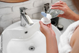 Woman preparing for her day in a modern bathroom with elegant decor and natural elements