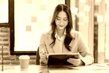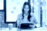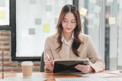 Professional woman engages in creative work with tablet at modern workspace for enhanced productivity and collaboration
