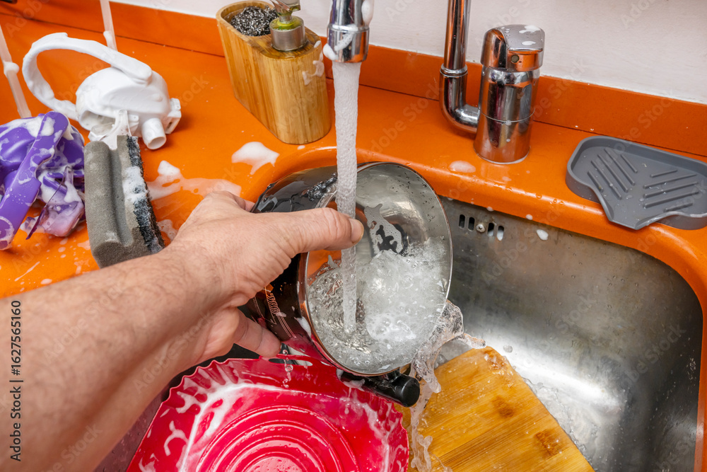Silhouette of a black pot under the stream, with flashes of light reflecting off the soap bubbles