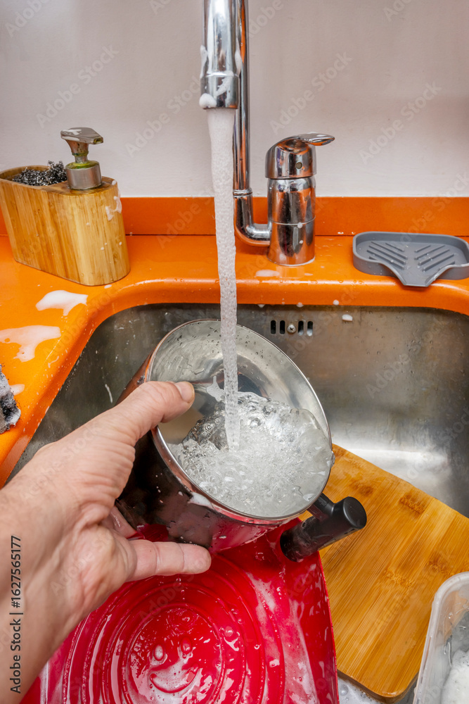 Conflicting textures: the softness of soap against the roughness of a sponge scrubbing a stubborn stain on a plate