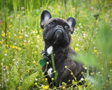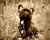 Funny dog. The bulldog's face in the pollen of plants. Tall grass, flowers