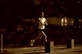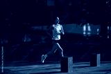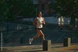 Female jogger in the early morning running along an urban street wearing casual sportswear. Concept of energy control, minimalistic motion, quiet discipline, and solo urban exercise.