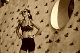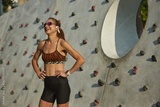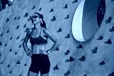 Woman relishing open-air exercise during sunny day climbing wall. Concept of confidence, athletic identity, toned female figure, and powerful pose.
