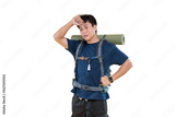 Exhausted hiker resting after a long journey, wiping sweat from his forehead on png background