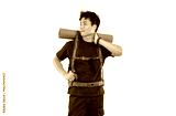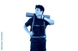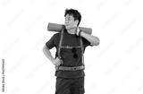 A young man preparing for an outdoor adventure with a backpack and a mat, looking forward with curiosity on png background