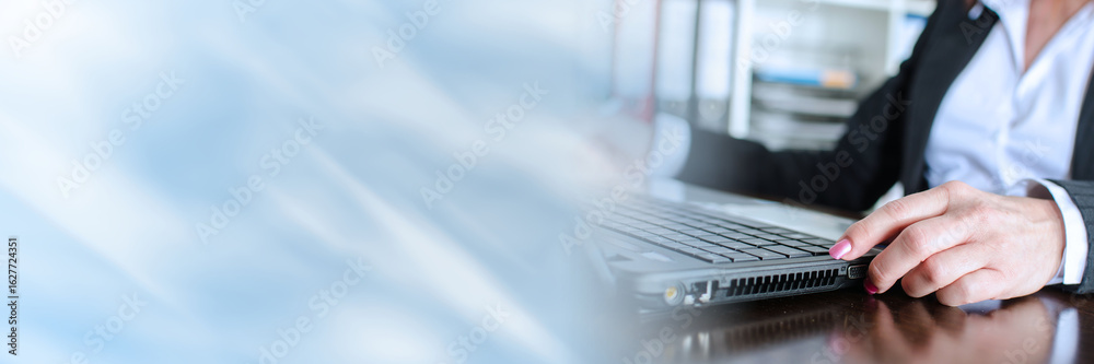 Businesswoman typing on a laptop; panoramic banner