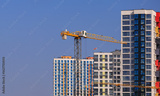 Construction of buildings and high-rise cranes against the blue sky