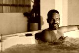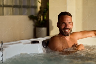 Smiling Man Relaxing in a Hot Tub at a Modern Spa Interior