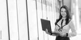 Successful businesswoman working at laptop. Business woman working. Woman with notebook. Woman using laptop, outdoors. Working out of the office. Occupation - insurance agent or sales manager.