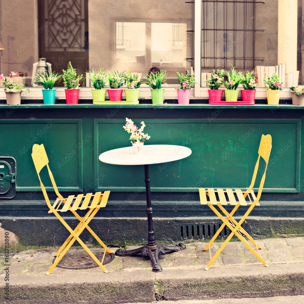 Vintage chairs and tables of an outdoors cafe in Paris