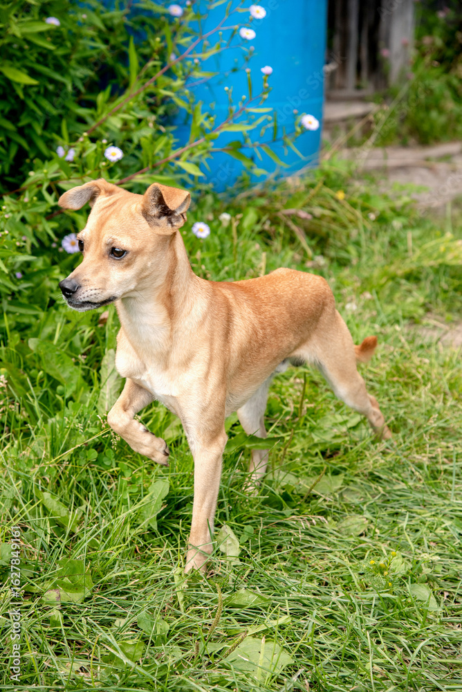 Red Pinscher dog standing on grass in summer