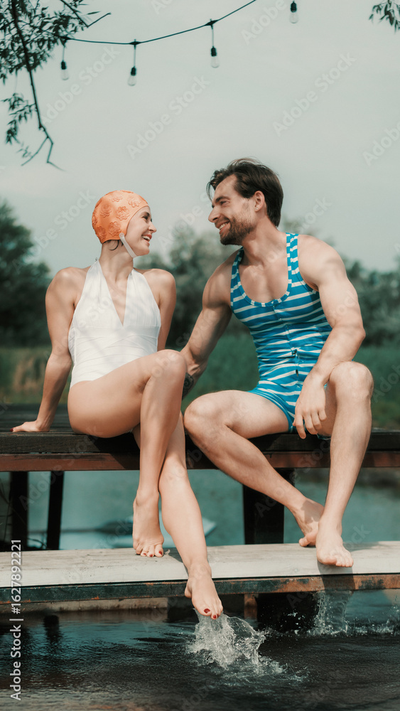 Smiling couple in vintage swimsuits sitting close on dock with feet splashing in water. Concept of romantic leisure, nostalgic summer mood, local travel posters, and lifestyle advertising.