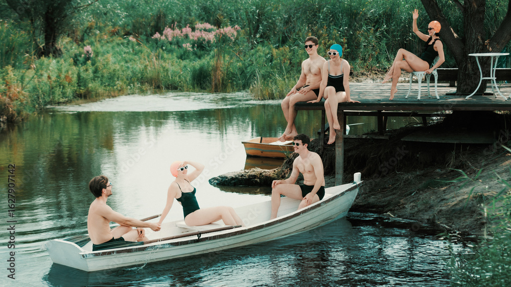 Group of friends in retro swimsuits relaxing on dock and in boat on calm river. Concept of vintage summer campaign, local tourism promotion, leisure lifestyle, and nostalgic poster visuals.