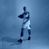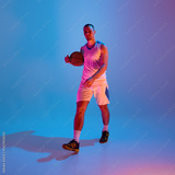 Man in athletic wear holding basketball under vibrant lights in gradient. Concept of calm presence, pre-game mindset, confident body stance, and urban sportswear presentation.