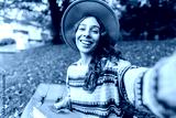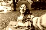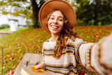 Portrait of young woman taking a selfie with phone in autumn park. Beautiful woman enjoying reading a book in sunset rays on a meadow. Autumn, blogging concept.