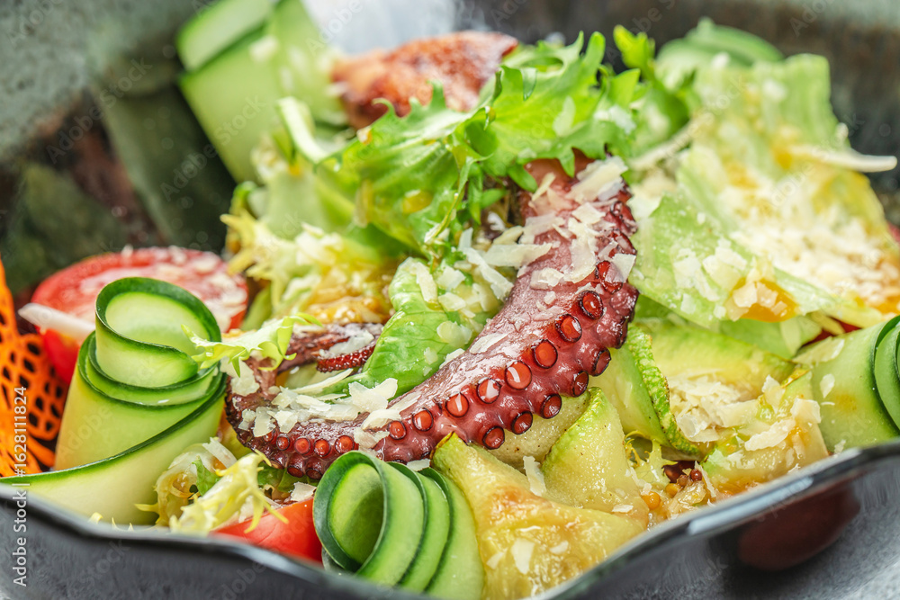 Fresh octopus salad with lettuce, cucumber ribbons, cherry tomatoes, and grated cheese in a black bowl