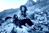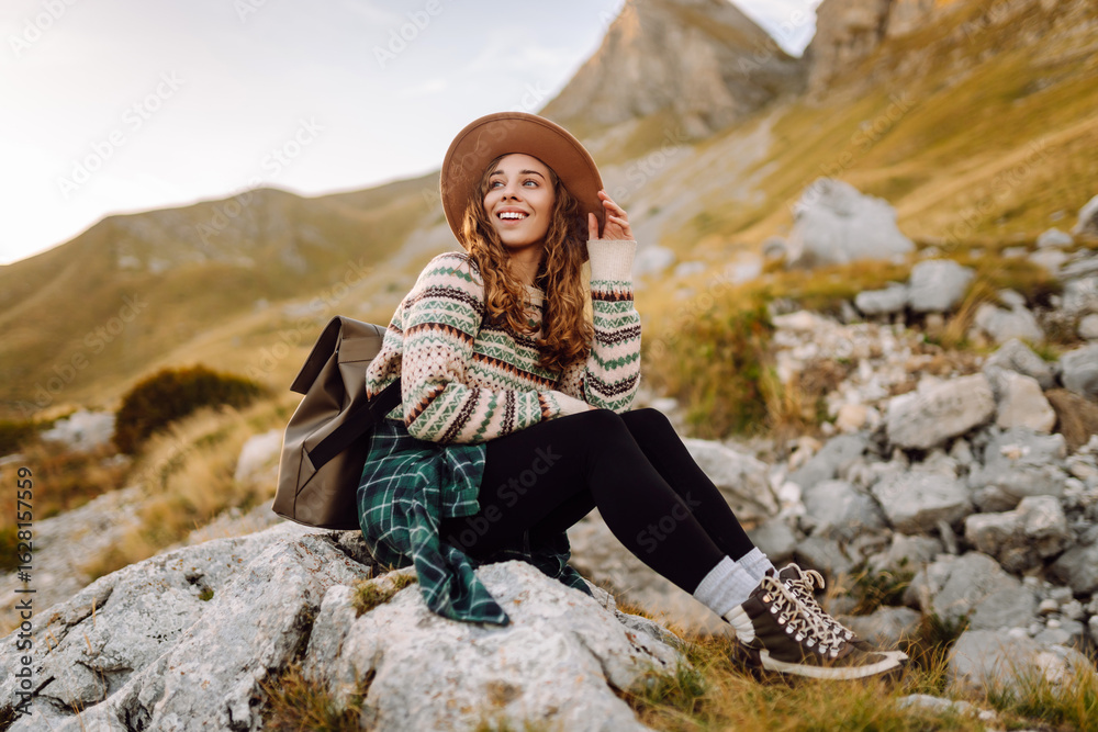 Happy female hiker in hat and authentic sweater with backpack enjoying mountain landscape on mountain trail. Young female hiker feels freedom surrounded by incredible landscapes. Active lifestyle.