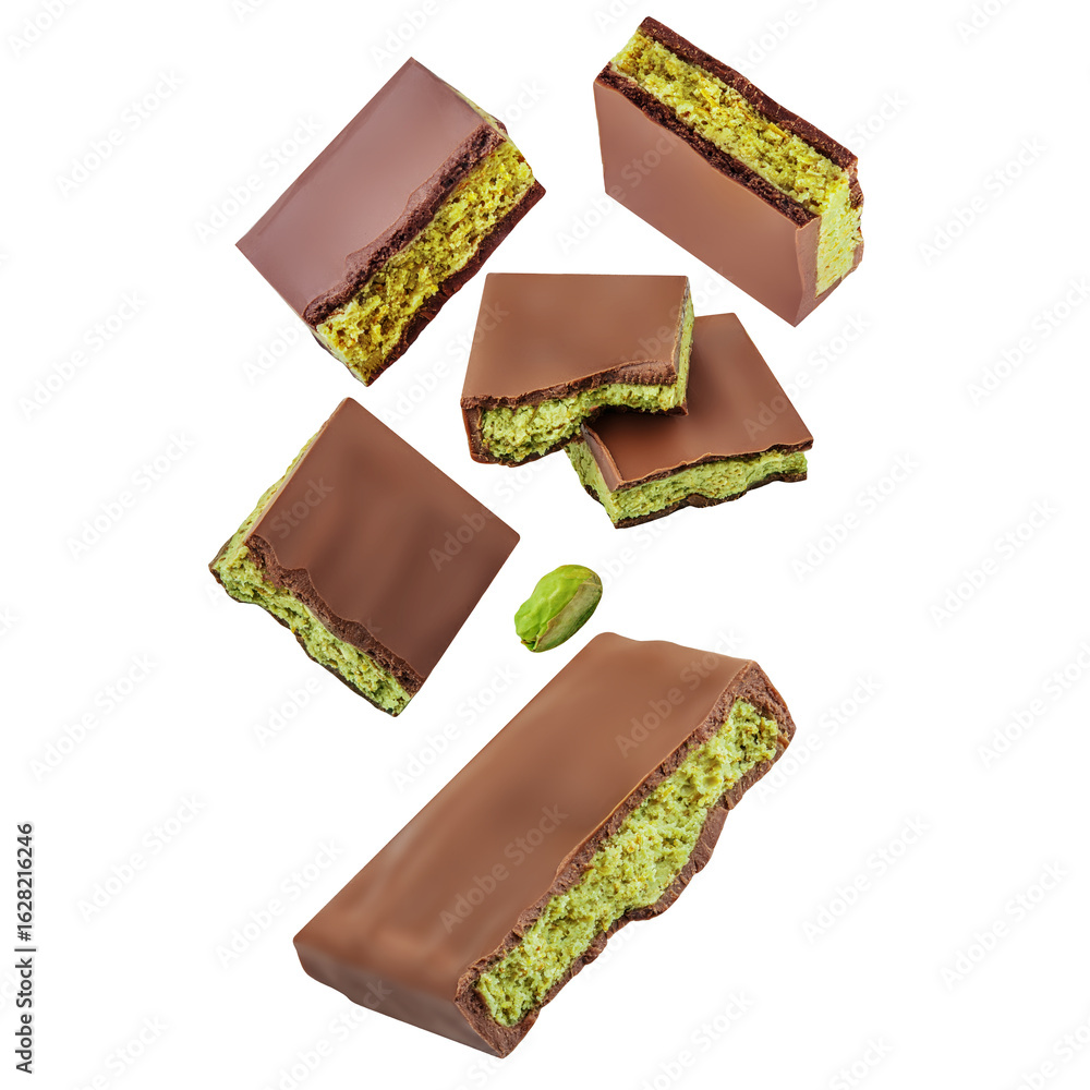 Flying Dubai Chocolate pieces isolated on white. Levitating Chocolate with pistachio paste and kadayif. Chocolate Explosion. Top view. Flat lay.
