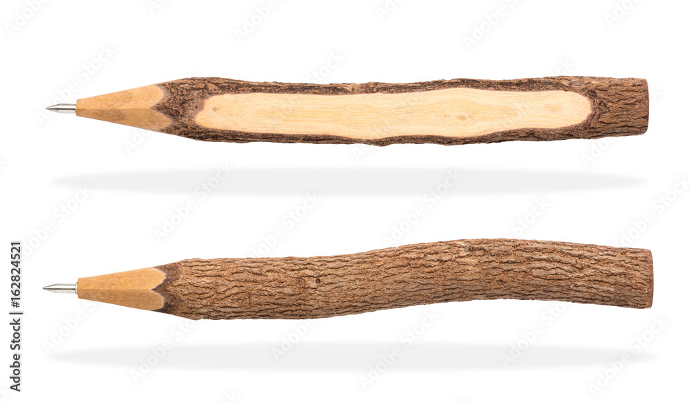 handicraft pen made from tree branch or twig, the one shown wood and the other shown bark isolated on white with clipping path