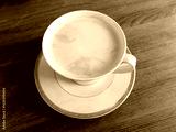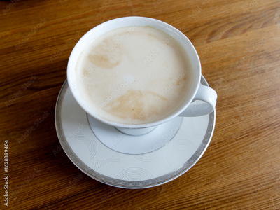 A white porcelain cup of coffee with milk, flat white, placed on a saucer standing on wooden table. Top view.