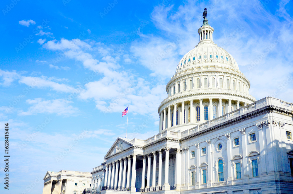 United States Capitol Building in Washington DC on Bright Sunny Day with Blue Sky