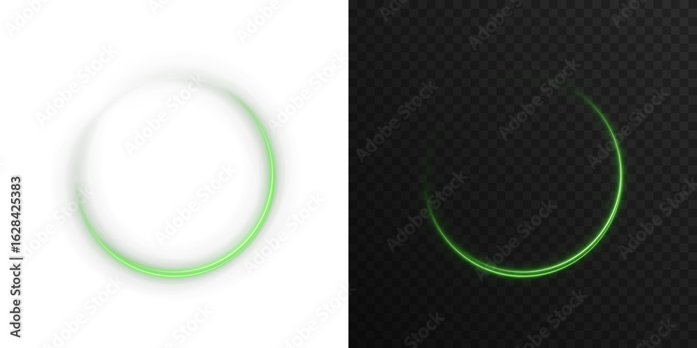 Neon glowing green rings with orbit effect and radial flare. Futuristic digital halo in dark space. Ideal for sci-fi design, UI interface, cosmic backgrounds, vibrant tech posters and energy concept