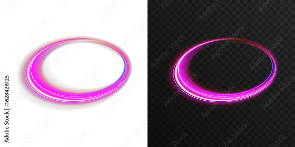 Futuristic glowing neon ellipse in vivid pink, blue, and violet tones on transparent dark background. Magic swirl ring energy flow, abstract portal light effect for sci-fi scenes, fantasy art, and dig
