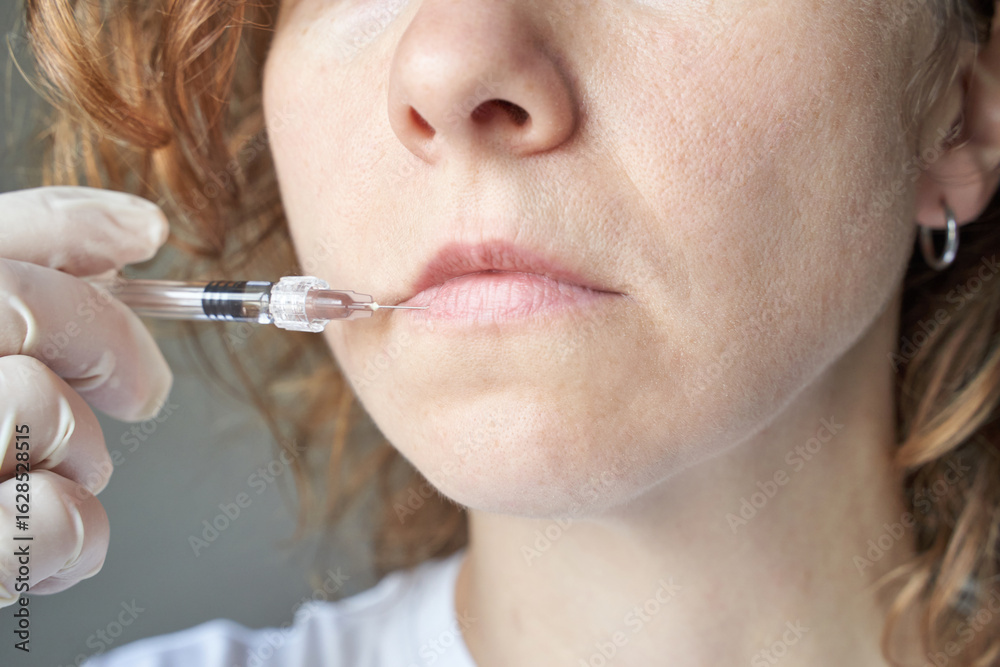 Caucasian adult female receiving lip injection with syringe in medical procedure.
