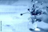 Hands are putting flowers in a vase on a wooden table.