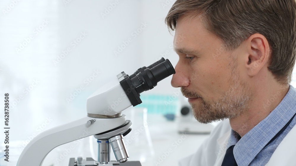 Male scientist using a microscope is doing scientific research in a modern laboratory, developing innovative medicine for healthcare. Medicine, healthcare and science concept