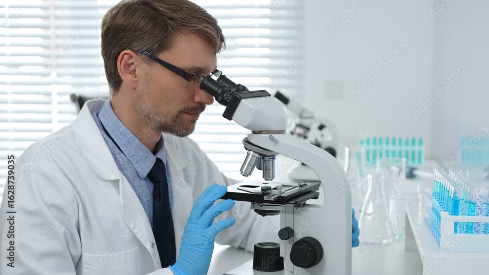 Medical scientist wearing gloves using microscope analyzing samples in modern laboratory doing scientific research. Medicine, healthcare and science concept