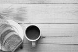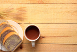 Tea time snacks, A cup of chocolate whit cookies, bread and rusk, top view